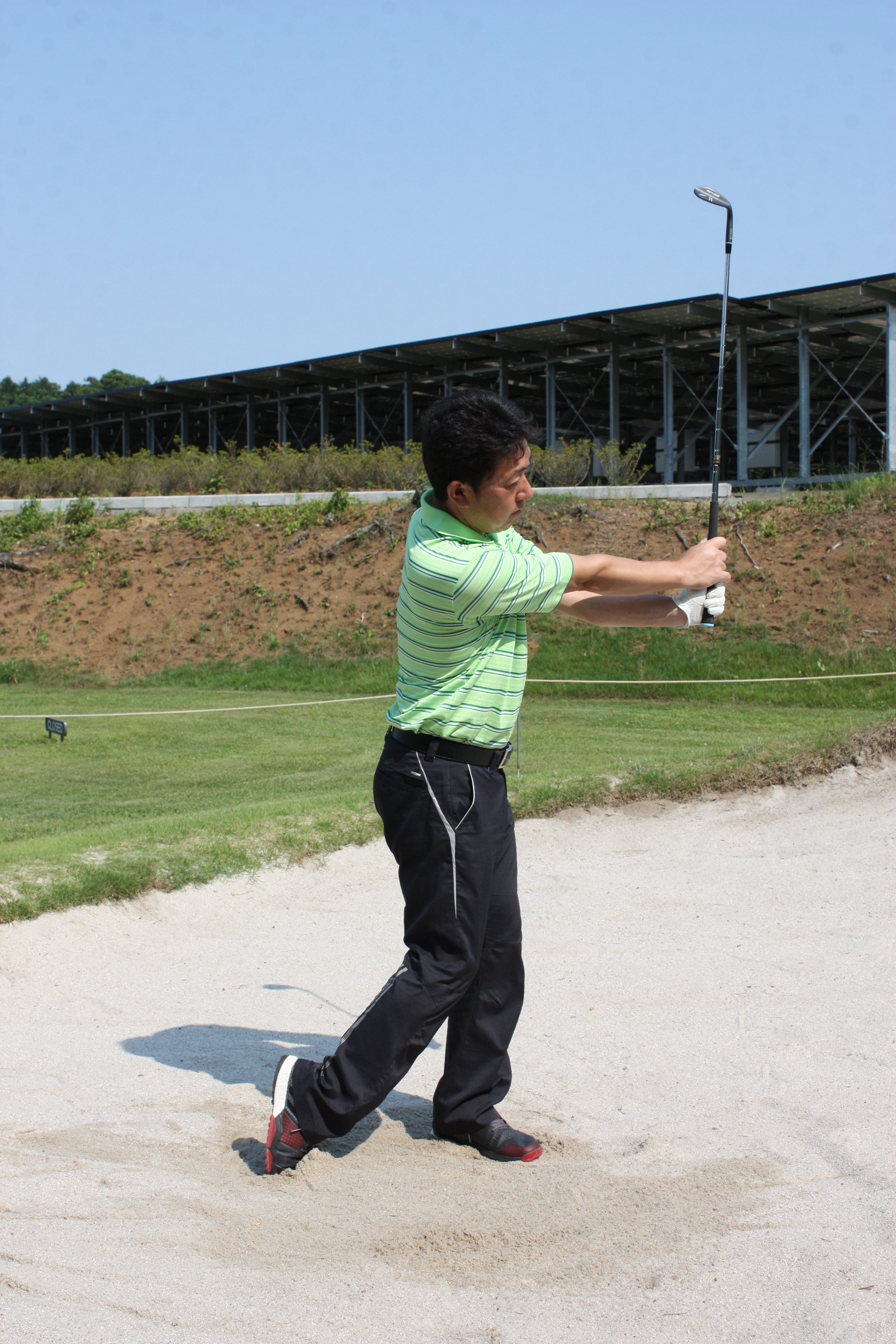 あとは前回で説明しました要領のL字スイングでしっかり振り抜きましょう。トレーリングエッジがボールの下の砂に入りますが、潜りすぎないように滑ってくれますので砂はあまりとれず、ボールが高く上がります。ある程度ヘッドスピードがないとボールは高く飛びません。インパクトは緩めてしまうと、トップしてしまうのでスイングスピードを緩めずにしっかりと振り抜きましょう。フェースが開いていますのでボールはそれほど遠くには飛びませんので、勇気がいりますが思い切りよく振りましょう。